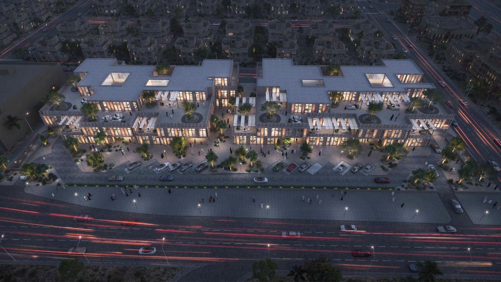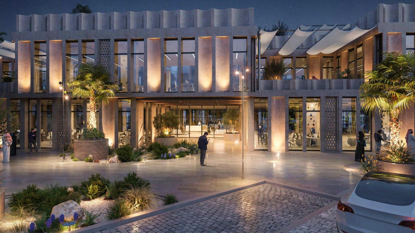 Warf is a modern office cluster project located in Riyadh, designed to provide a high-quality and integrated work environment. The development consists of two interconnected buildings with ground, first, and second floors, in addition to rooftop areas, offering flexible office units suitable for a wide range of businesses